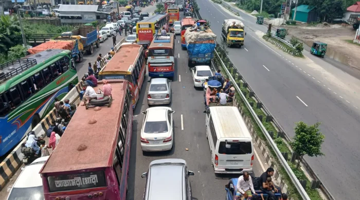 ঢাকা-টাঙ্গাইল-যমুনা সেতু মহাসড়কে ৩০ কিলোমিটার এলাকাজুড়ে যানজটের সৃষ্টি হয়েছে। এতে দুর্ভোগে পড়েছেন ঈদে ঘরমুখী মানুষ। এদিকে খোলা ট্রাকে বৃষ্টিতে ভিজে ছাতা মাথায় নিয়ে উত্তরবঙ্গগামী যাত্রীরা বাড়ি ফিরছেন। ভোর থেকে অতিরিক্ত
