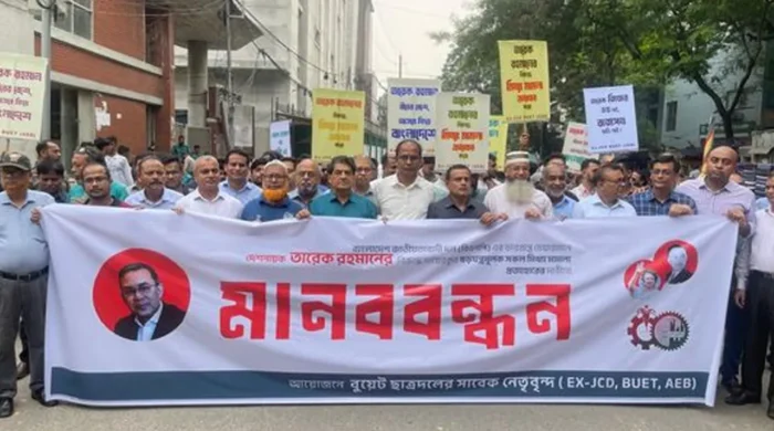 বিএনপির ভারপ্রাপ্ত চেয়ারম্যান তারেক রহমানের বিরুদ্ধে সকল ষড়যন্ত্রমূলক ও মিথ্যা মামলা প্রত্যাহারের দাবিতে রাজধানীতে মানববন্ধন করেছেন বুয়েট ছাত্রদলের সাবেক নেতারা (এক্স-জেসিডি-বুয়েট)। বৃহস্পতিবার (১৭ অক্টোবর) সকালে জাতীয় প্রেস ক্লাবের সামনে এ